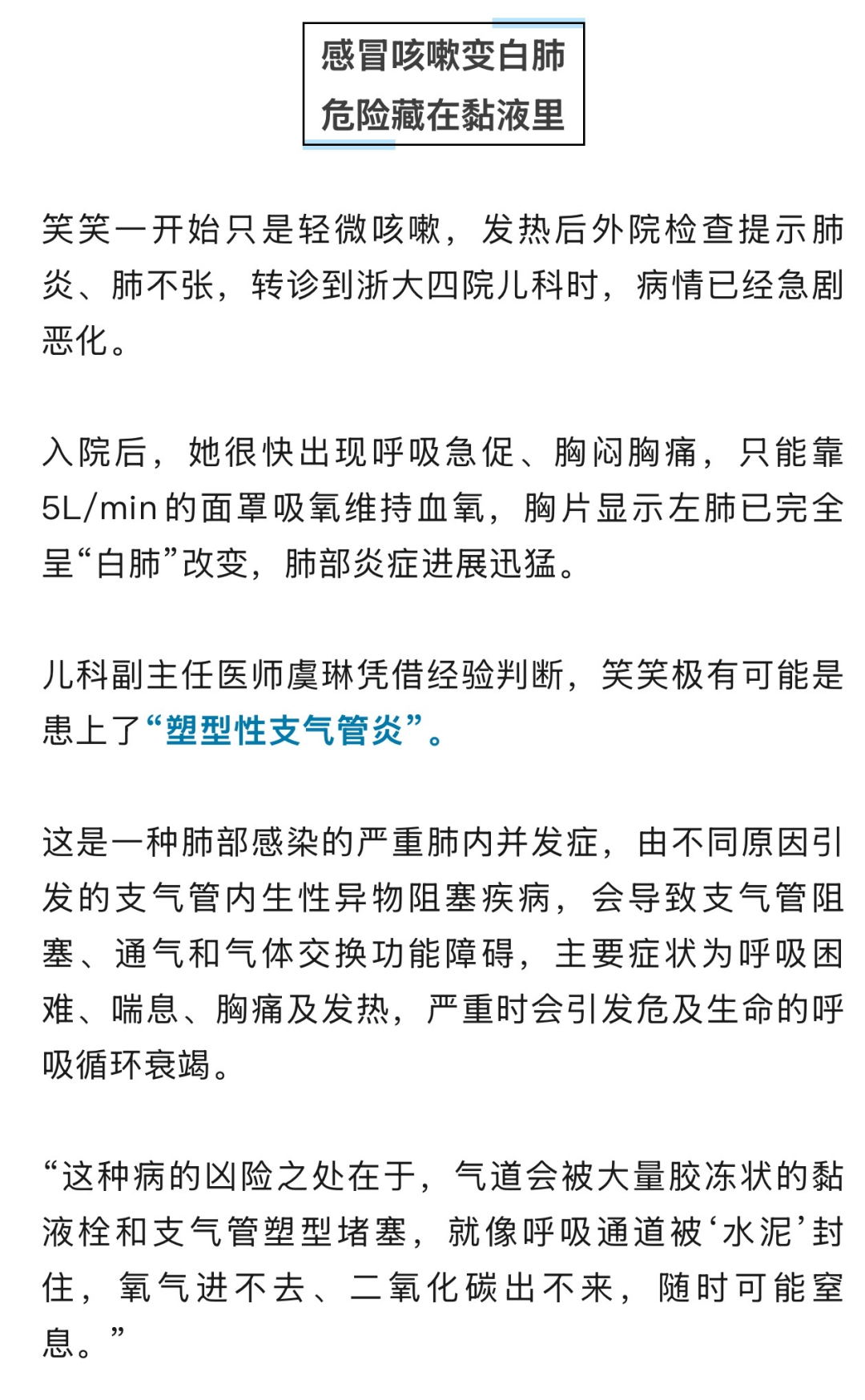 在浙大四院儿科等多学科团队的努力下,笑笑已经转危为安。不过这次来势汹汹的急症背后,藏着一种容易被忽视的急性重症呼吸道疾病——塑型性支气管炎。
