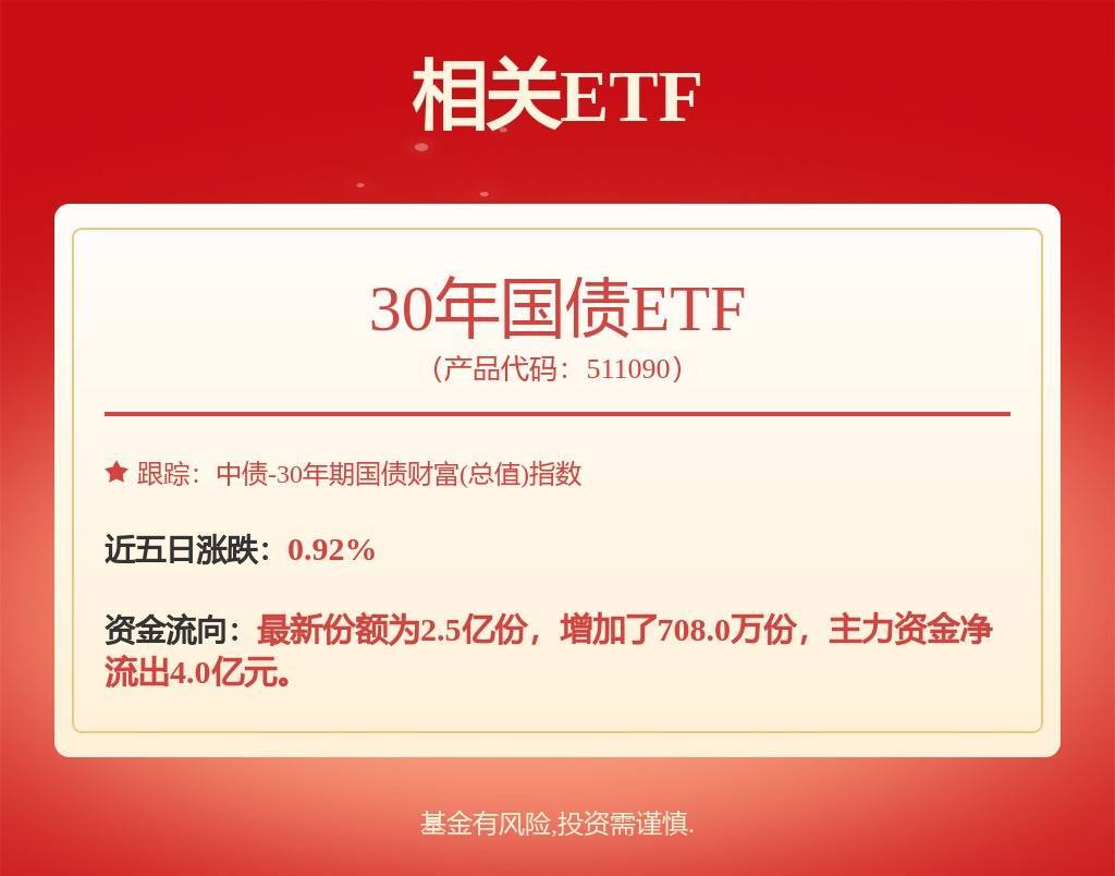 10月21日讯,国债市场早盘涨跌不一。截至上午10:00银泰证券,30年国债ETF(511090)跌0.05%。债市方面,30年期国债期货合约(TL2512)最新价为115.31元,跌0.10%,成交量为23719手,总持仓量为148501手。其余国债期货合约10年期国债(T2512)涨0.03%;5年期国债(TF2512)涨0.04%;2年期国债(TS2512)涨0.03%。(数据来源:中国金融期货交易所)